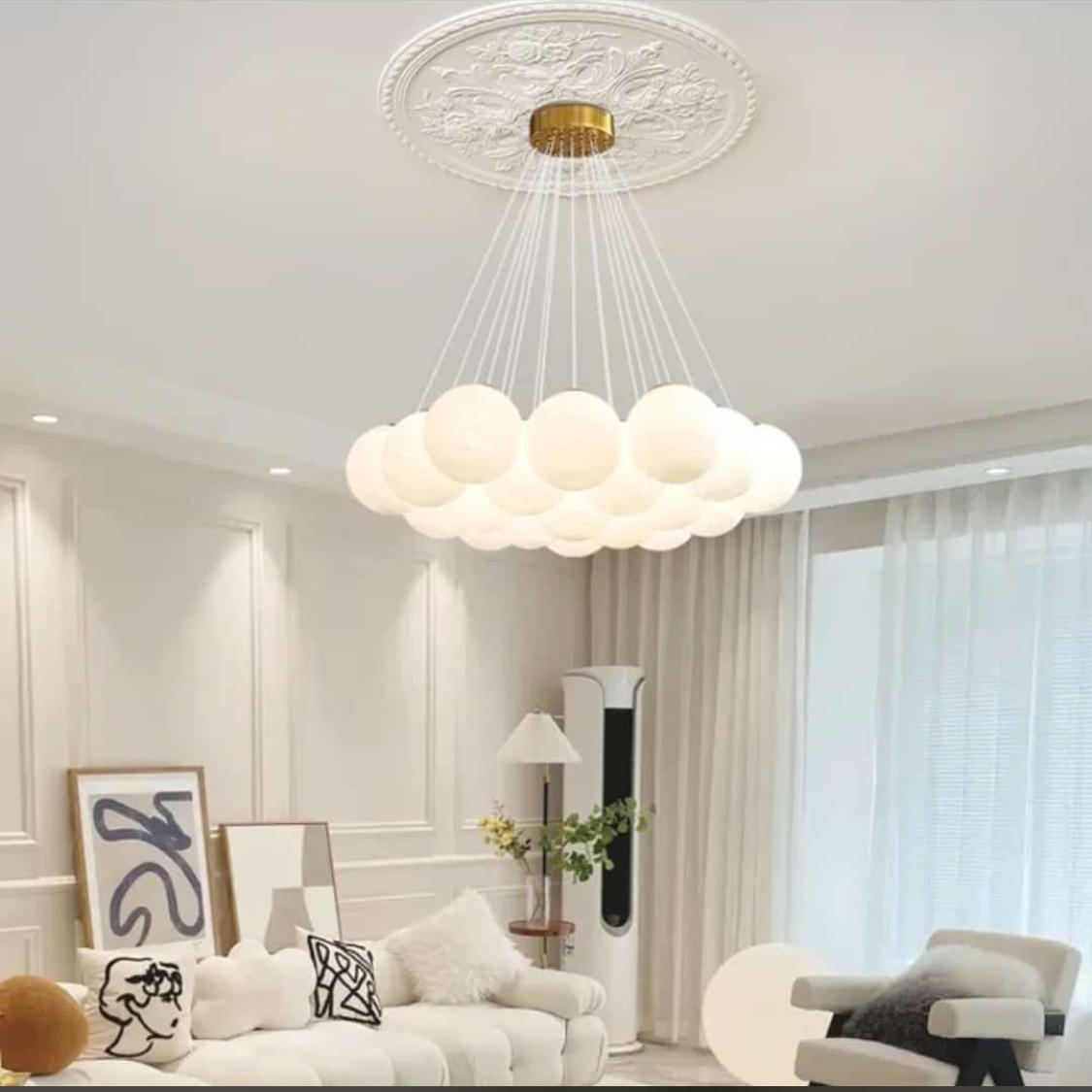 bubble chandelier, a modern style of pendant lighting featuring multiple white or frosted glass globes clustered together.