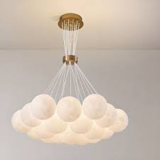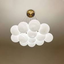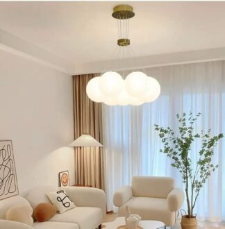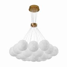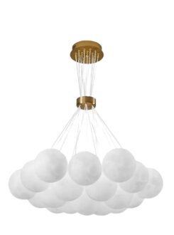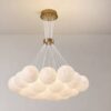 This light is a modern bubble ball chandelier (also known as a globe or sphere chandelier) that comes in various brand names and configurations. It features multiple frosted white glass or acrylic globes suspended by thin wires from a gold-finished ceiling base.